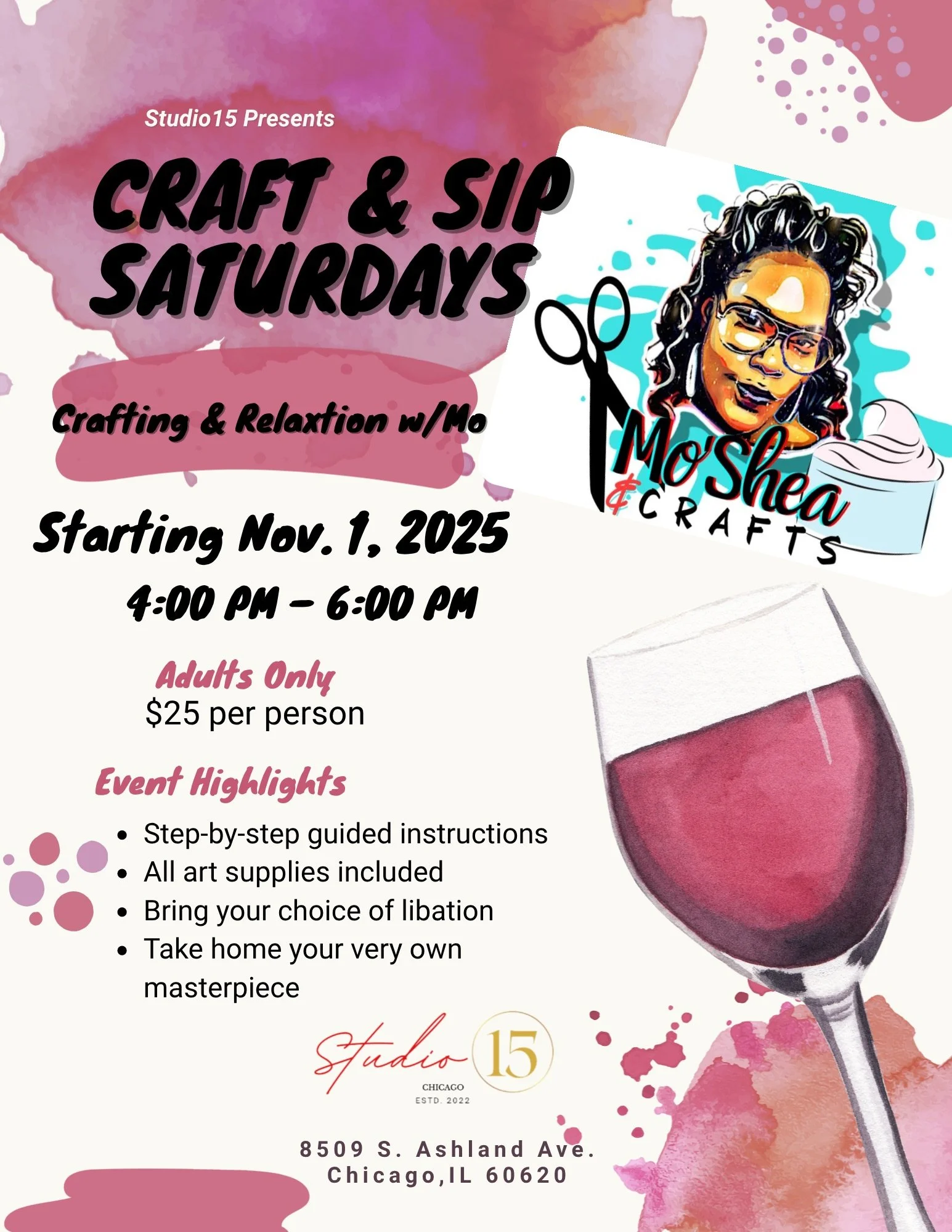 Categories: Select a Category Events Workshops & Painting Events | Craft & Sip Saturdays 2025 $25.00 November 1st November 8th November 15th November 22nd November 29th December 6th December 13th Purchase Added! 4th Van Wade Art Exhibition $0.00 Register Added! Open Paint Night at Studio15 Chicago $29.99 November 7th November 14th November 21st December 5th December 12th December 19th Purchase Added! Pizza 🍕 with Dreezy Claus! $15.00 Purchase Added!