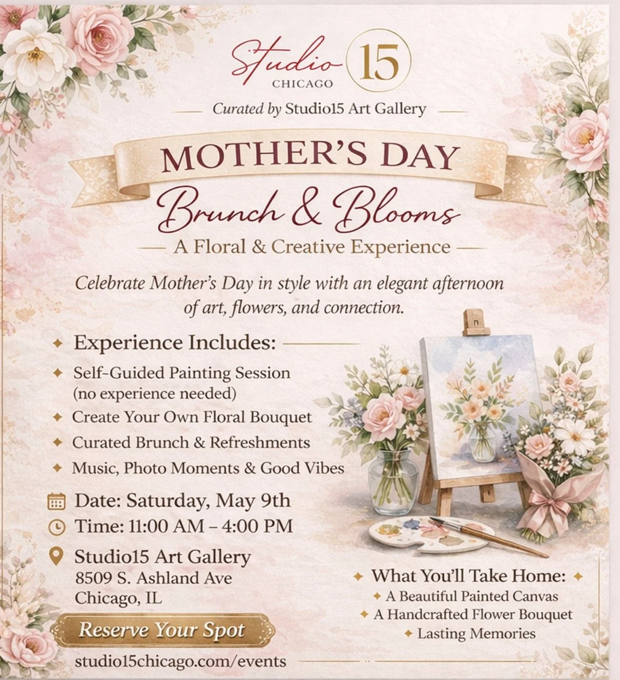 Join us for a Motherโs Day Brunch & Blooms Experience at Studio15 Art Gallery ๐๐จ